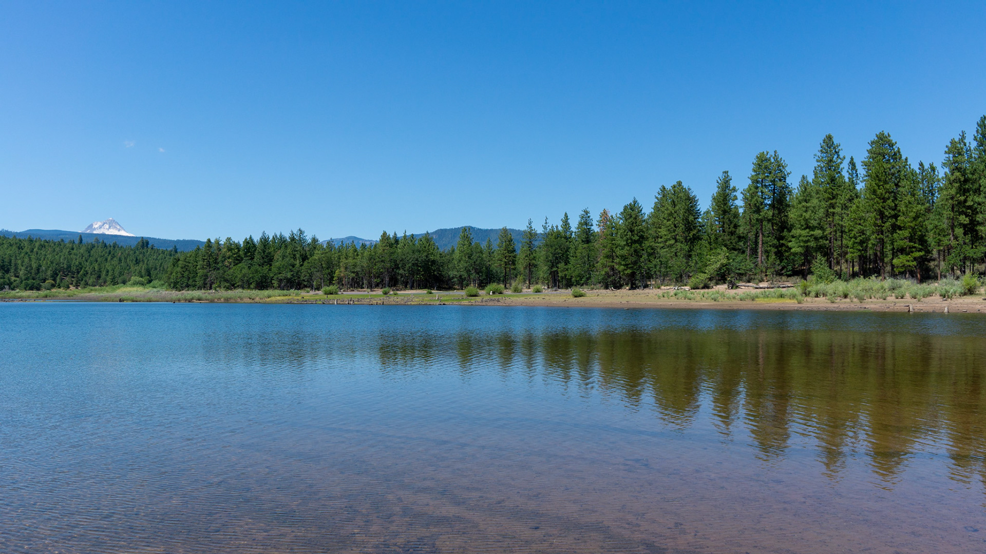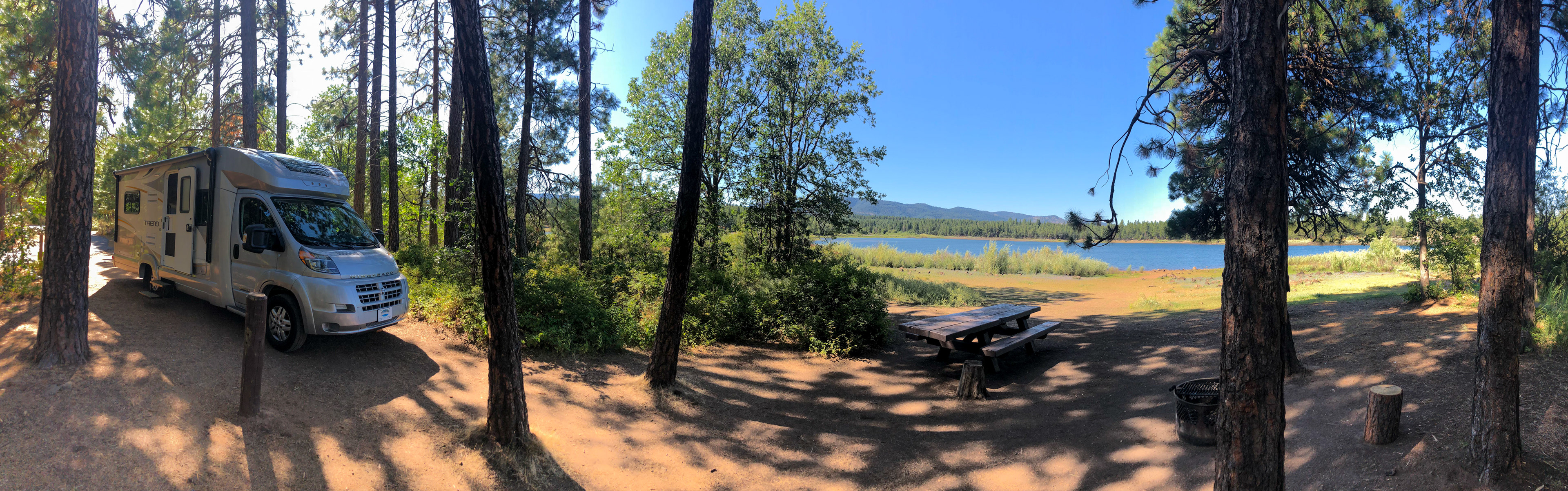 Random brought me to this beautiful spot campground. I was driving a small, fantastic and little driven road, the NF-48, from West to East, when I found this campground. I landed first in the day use area, which was in July 2019 $5 per visit. Later I drove over to the campground, which was $23 per night. The board at the entry did not make clear about how to pay for the stay and there have not been envelops. Just after the entry has been a camp site "HOST" but also a sign "OFF DUTY". I past that and picked site 11 right on the lake. A few hours later the camp hosts, a lady and a man, drove around into a golf cart to collect the fees from the new arrivals. She said that she was a former pre-school teacher and was very friendly. Altogether the campground was very quite, no car or city noises, just the sounds of nature, like the geese on the lake. The night was pitch dark and fantastic for star gazing. Throughout the campground were water faucets to refill your RV tanks. I did not visit the baths, so I can't comment on those. Cell reception was one bar AT&T if the hotspot was placed well, near the lake. I took a bike ride to the nearby village and noticed many of the homes and mobile homes are for sale, starting at around $60K. I assume it gets too far out and lonely for people who once invested here into a residence. One said: It's hard to access this area in the winter. The lake seems to fluctuate its water levels. In late July 2019 it still had a decent level. Marks on the shore suggested that it was like 6-8 feet higher at an earlier time of the year. Google earth looked to me that the lake can be much lower later in the Summer as it was on my visit. Great was too that I could see Mount Hood, with its snow top, in about 15 miles distance from my camp site.